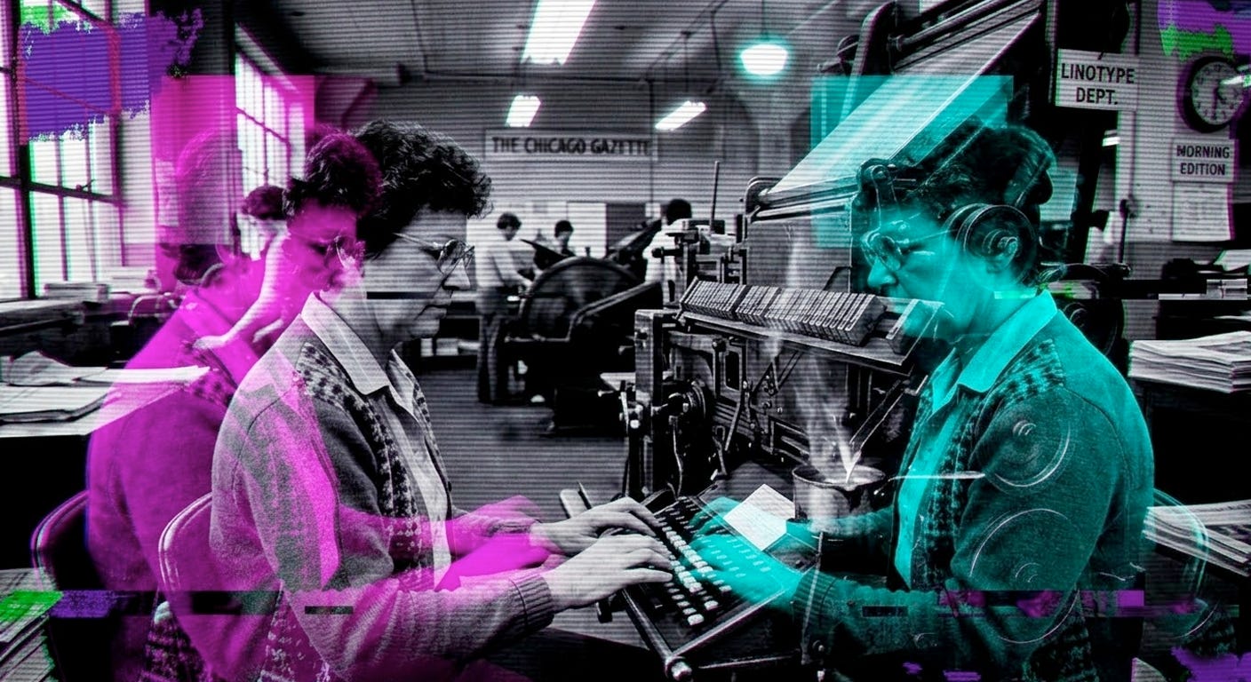 The typesetter did not disappear. That is the framing people get wrong every single time a role dissolves. The typesetter dissolved and reconstituted itself as the desktop publisher, the graphic artist, the digital designer. No, you cannot turn smoke and ash back into wood, but those atoms do not go away, they become something else.
