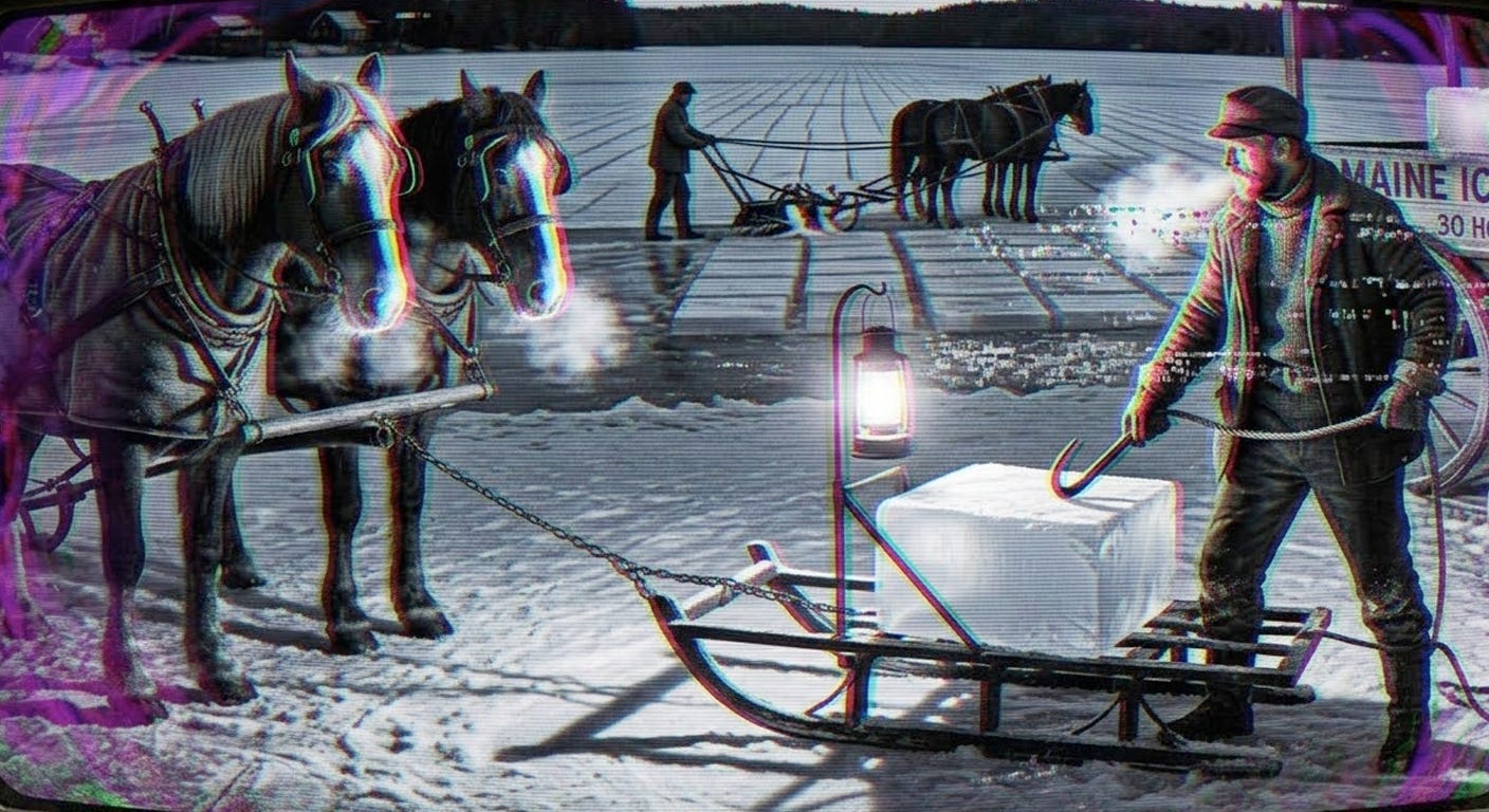 This pattern repeats across every industry that has ever automated a translation layer. Before mechanical refrigeration, Frederic Tudor built a global empire around harvesting natural ice from New England lakes, insulating it in sawdust, and shipping it as far as Calcutta. An entire supply chain: harvesters, transporters, storehouse operators, delivery drivers. The need for cold did not disappear when the refrigerator arrived. The need for a full-time human dedicated to providing it did. That transition took thirty years. It was not gentle.