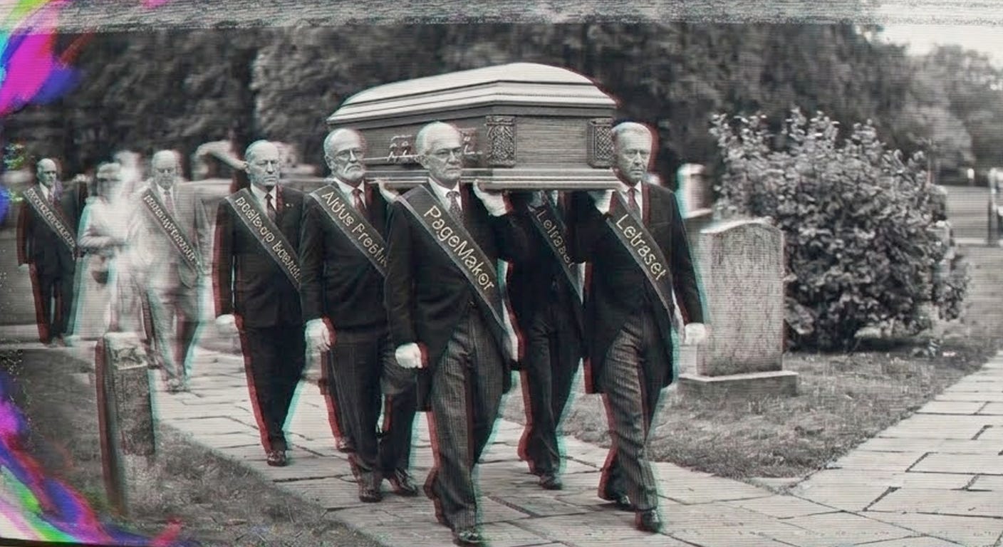 The roll-call of the pallbearers carrying the casket of the typesetter walk proud: PageMaker, QuarkXPress, Aldus Freehand, Letraset, paste-up boards, waxing machines, photo-typesetting. Feel the weight of the tools that did not survive, and notice that the knowledge of the people who used them did.