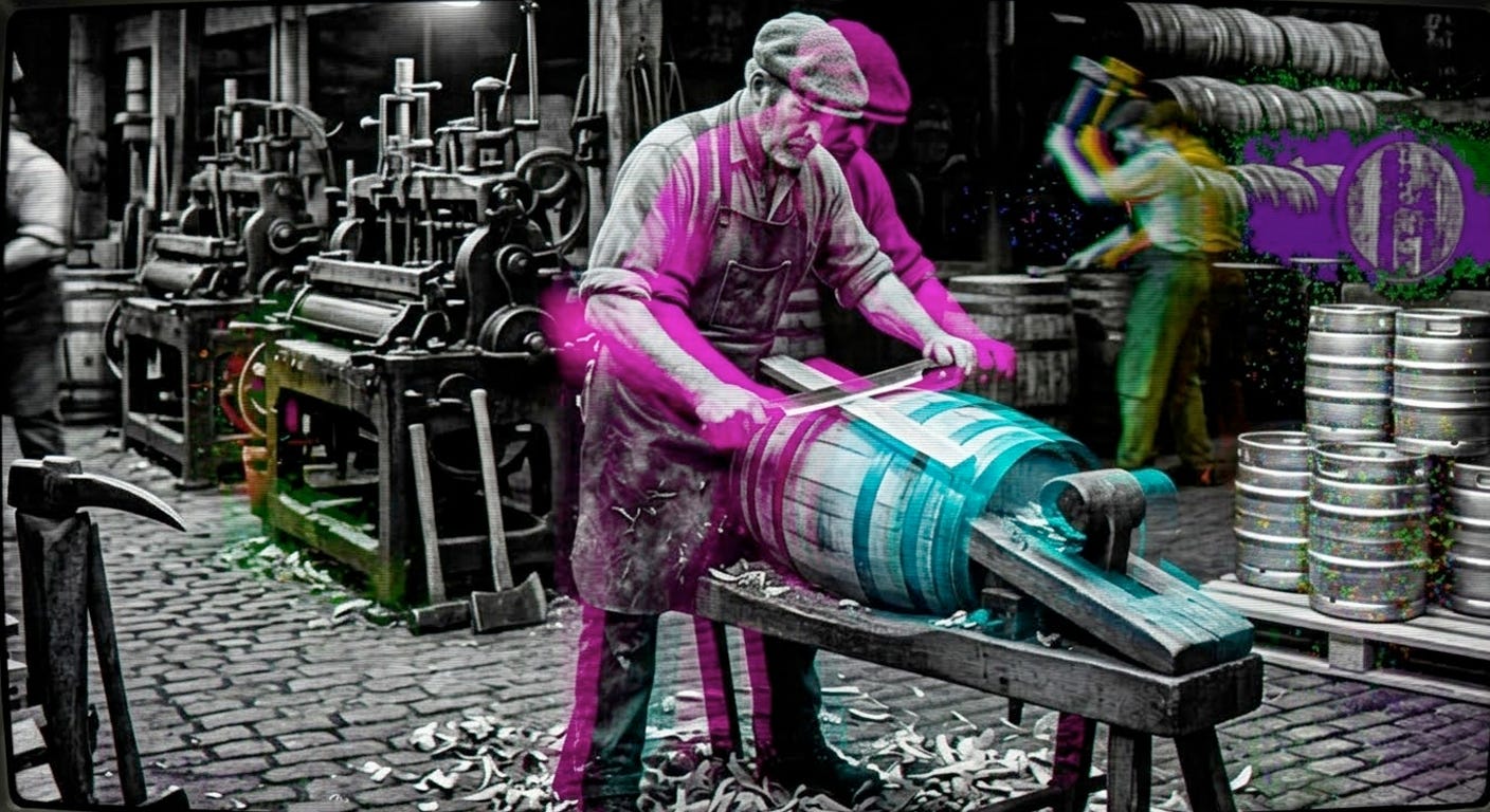 It is 1955. A cooper named Seán shapes oak staves into barrels in the cooperage at Guinness Brewery, St. James’s Gate, Dublin. He learned the trade from his father, who learned it from his. The brewery begins switching to metal kegs. The transition takes forty years. Beer still needs containers.