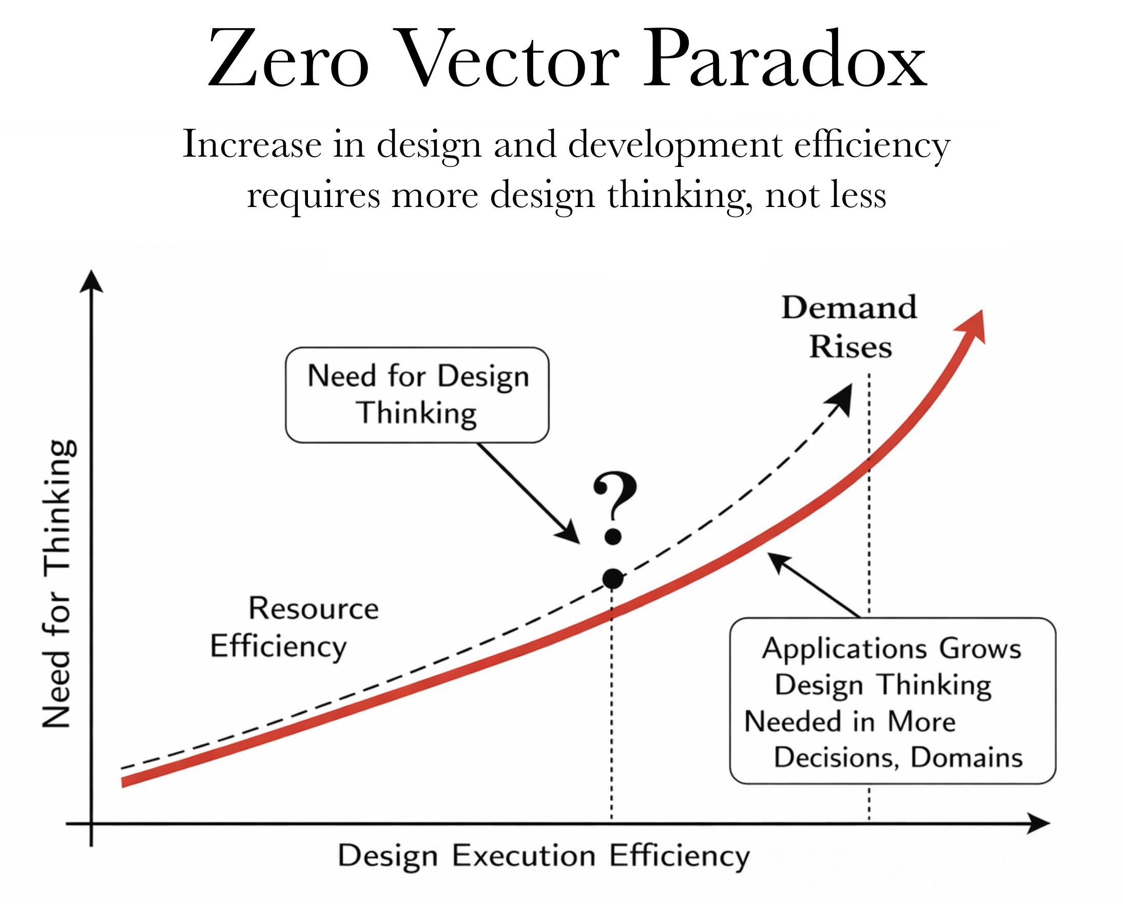 William Stanley Jevons observed in 1865 that making coal more efficient did not reduce coal consumption. It increased it, because efficiency made coal useful in more applications. The same dynamic applies here in The Zero Vector Paradox: Making design execution more efficient through AI does not reduce the need for design thinking. It increases it, because design thinking becomes applicable to more decisions, more domains, more moments in the product lifecycle. But the form of the work changes completely.