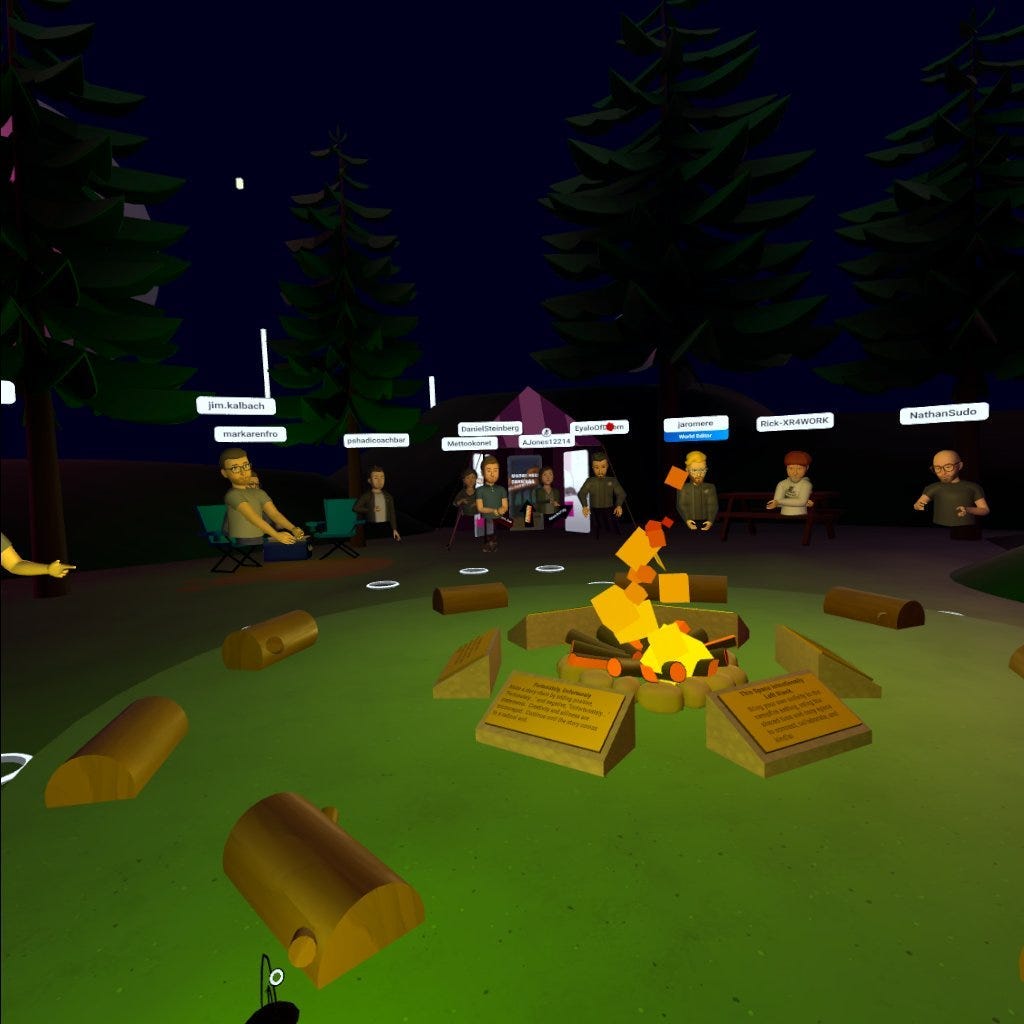 Don Carson is sitting in a plush, floating easy-chair near the fire. Former Disney Imagineer, current senior creative director at Mighty Coconut, and tonight he is giving an informal fireside on environmental storytelling to a group of strangers gathered on a crater-strewn rock in deep space. His voice is spatially located (turn your head and it shifts, walk closer and it gets louder). You took a rocketship to get here, launching from the moonbase below, and your brain accepted the transition so completely that the home office you are actually sitting in has ceased to exist.
